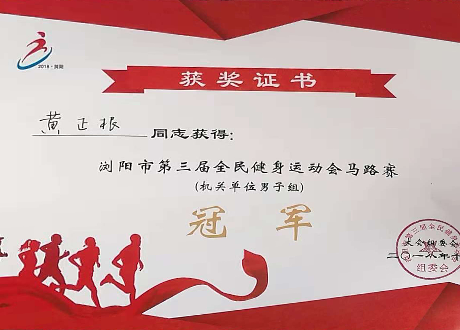 11月9日,在瀏陽經(jīng)開區(qū)職工運動會男子長跑比賽中,黃正根以十七分零六秒的成績第一個沖過終點,為公司爭得了第一塊金牌。前些日子,在瀏陽市第三屆全民健康運動會馬路賽比賽中,黃正根代表瀏陽經(jīng)開區(qū)參加比賽,同樣也獲得了冠軍。